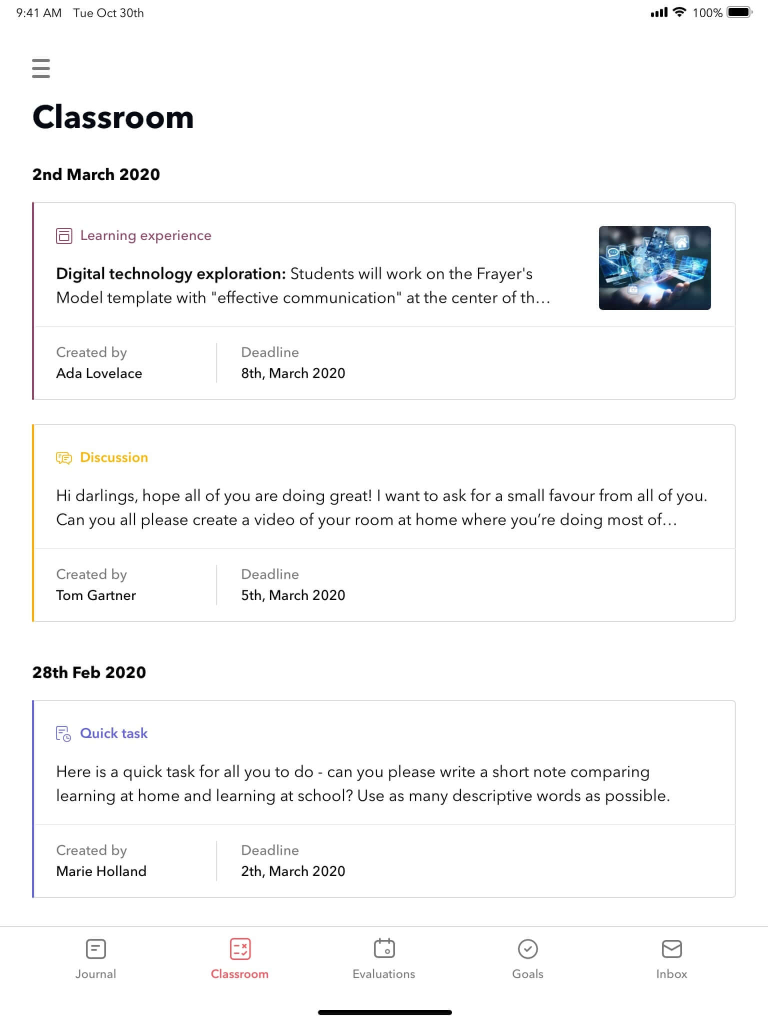 Keep engagement high by encouraging students to have discussions with each other. Discussions can be focused on learning or on general well being of students. Students can respond to discussion prompts through text comments, photos, videos, and more